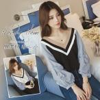異素材 春ニット トップスセーター パプ袖 Vネック ボリューム袖 バイカラー 異素材 【10~14営業日発送予定】